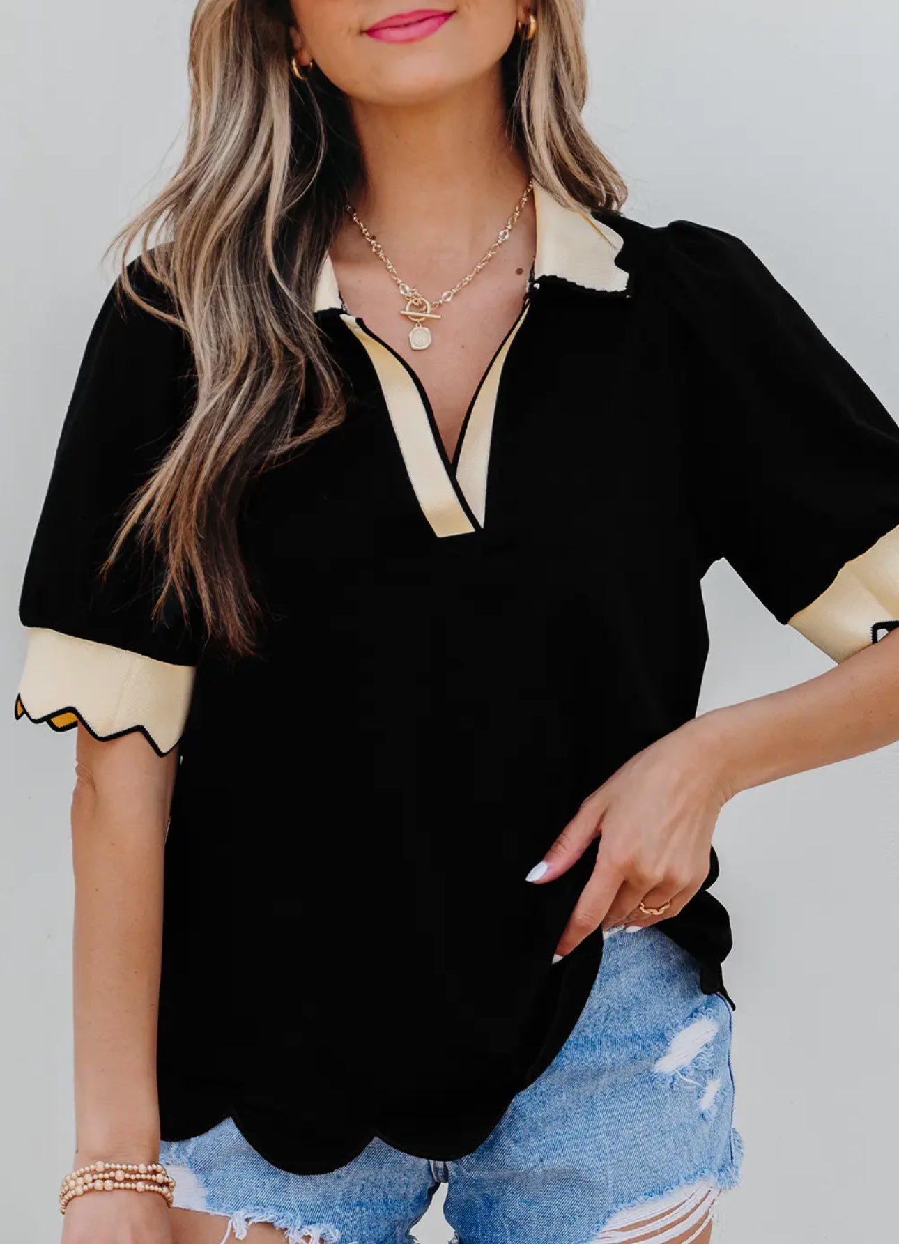 Color Contrast Collared V Neck Puff Sleeve Blouse