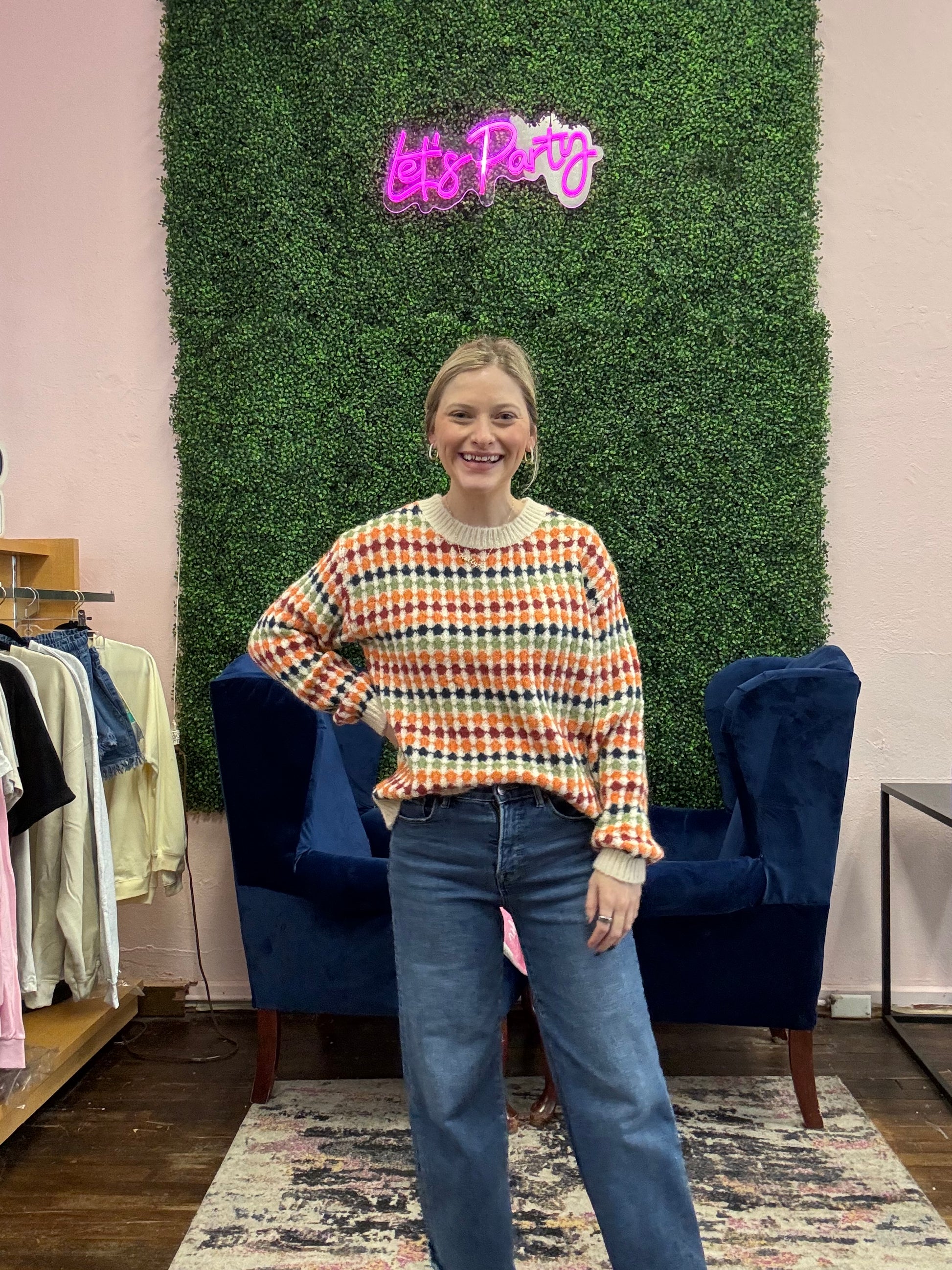 Bring fun to your wardrobe with this sweater. Its playful design add vibrant charm, while the shoulder keeps your look relaxed and casual. Crafted from soft, stretchy knit fabric, it offers cozy warmth and all-day comfort. Easily pair it with solid bottoms for a balanced, cheerful outfit perfect for any day. Polyester/Poly/Wool/Spandex